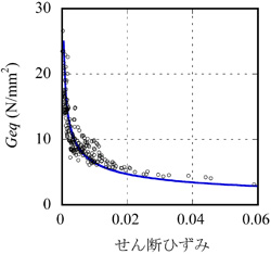 実験式は、せん断ひずみ10%~400%の範囲のデータを近似するように作成したものですが、10%以下の領域に外挿しても観測結果を良く近似していると思われます。