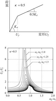 降伏後の剛性低下の変化に対する共振曲線の移り変わりを、3つ並べた左-中-右のグラフで比較して見て下さい。