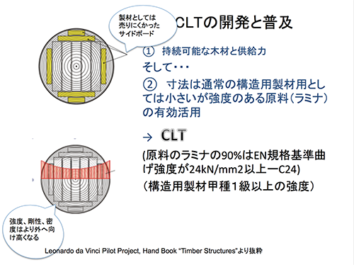 材料とエネルギーの面から木材を使い尽くすための総合的な戦略としてCLTが開発されたことがわかる。