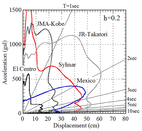 【図1】に、兵庫県南部地震やノースリッジ地震などで観測された地震動の加速度応答スペクトル(減衰定数h=0.1)を示す。同様に【図2】は、縦軸に最大加速度応答を横軸に最大変位応答をプロットしたスペクトルである(h=0.2)。建物の周期1秒前後では、加速度・変位ともに非常に大きい。一般に、観測地震動の加速度応答スペクトルを見ると、周期4秒以上では地震波の種類にかかわらず応答は殆ど一定であり、その応答レベルも小さくなる。この領域に免震建物の周期を設定することで、より高い免震効果を得ることが可能となる。
