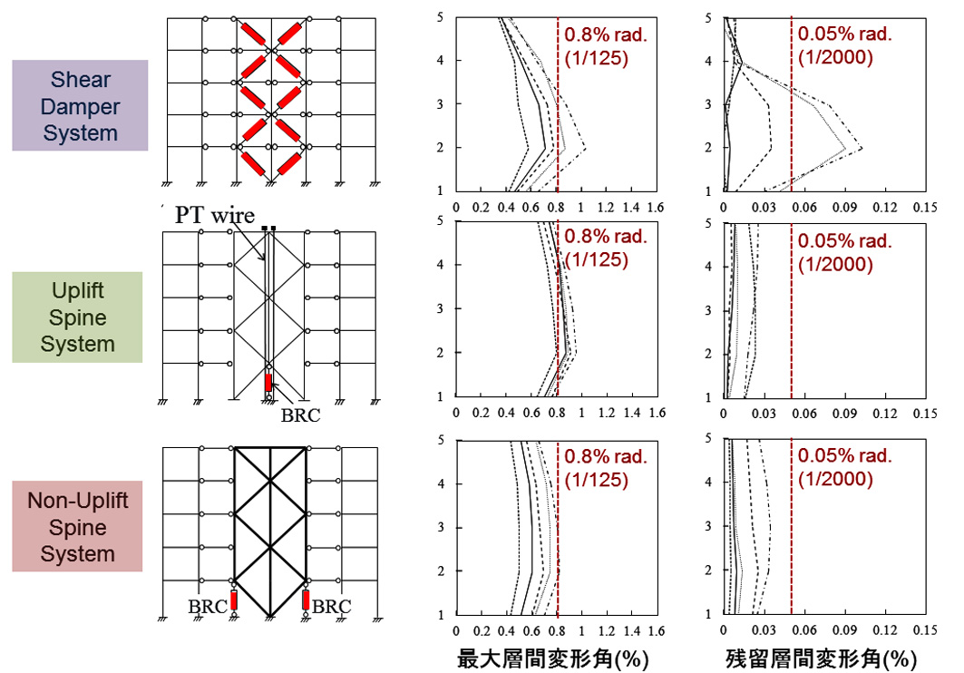 しかしセルフセンタリング機能のない下段のNon-uplift Spine Systemでもそれほど遜色ない性能を示しており、主構造が十分に残留変形の制御性能を有していることがわかります。