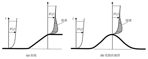海岸の崖地や丘の上には、眺望を考慮してかホテルやマンションなどが多数建っています。斜面を上り始めた所では平坦な所に比べて風は弱くなりますが、上っていくにつれて次第に増速し、【図5.3】に示すように、頂上付近では平坦な場合に比べて大きくなります。増速の程度は、斜面の傾斜角と場所によって変わりますが、1.2~1.3倍になることもしばしばです。このような場合、再現期間50年(「損傷限界」に相当)の風であっても、地形の増速効果によって再現期間約500年(「安全限界」に相当)の風が吹くことになります(再現期間500年の風速は再現期間50年の値の1.25倍程度です)。風速が1.5倍になれば荷重は2.25倍になります。このような地形による増速効果は建築基準法には盛り込まれていませんが、荷重指針には二次元的な地形に対する風速増速率を計算する式が与えられていますので参考になります。しかし、現実にはそのような単純な地形ではなく、三次元的で複雑なものが多く、適用に当たっては注意が必要です。近年では、コンピュータおよび数値流体計算の発展が目覚ましく、シミュレーションによって地形の効果を検討することが可能になってきました。しかし、数値流体計算の結果は、使用する計算モデルや境界条件の与え方、メッシュ分割等によって大きく変わりますから、その利用に当たっては専門知識を有する機関に相談することが不可欠です。