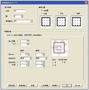 [建物DB]モ-ドでは、標準材料の定義・配置、柱や梁などの部材の定義・配置、積載荷重や特殊荷重の定義・配置などを行ない、建物デ-タを作成します。