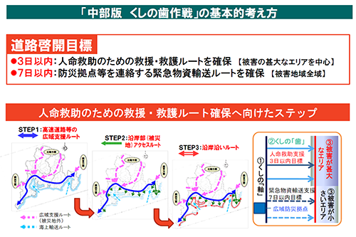 東海地域では、中部地方整備局が中心になって、災害時の道路啓開計画「くしの歯ルート」が作られています。ですが、調べてみると、国が直轄管理している第1次緊急輸送道路の中にも地震時に段差が生じる可能性がある橋梁が多数存在することが分かりました。一方、都道府県や市町村の道路については、耐震化の進捗状況や完了時期の情報公開も十分にさていません。経済活動の継続や早期復旧に重要となる道路については、地方道であっても国道と同等の耐震性を確保するなど、優先順位を明確にして、メリハリのある対策をするべきです。