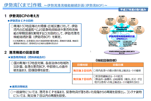 日本随一の産業拠点を支える伊勢湾・三河湾については、中部地方整備局が航路啓開計画「くまで作戦」を作っています。ですが、要となる「耐震強化岸壁」には未整備箇所が多く残っています。また、LNG、石油、LPG、石炭などの多くは民間岸壁に依存しています。このため、民間岸壁の耐震化促進策も必要です。災害後に行われる航路啓開も、現在は公共の耐震岸壁のみが対象になっていますが、エネルギー確保のためには、民間岸壁も対象にすることが必要だと思われます。また、タグボートの絶対数が不足しているので、津波からの早期退避のためには、舳先を海側に向ける出船での着桟を考える必要もあります。