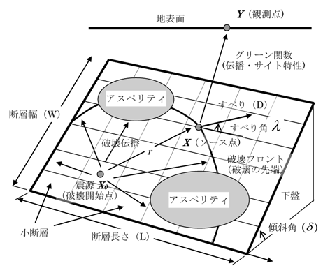 主なパラメータには、断層位置の長さ(L)・幅(W)、断層面の傾きである傾斜角(δ)、破壊の開始点(震源位置:X0 )とその伝播速度(Vr)、断層各点(ソース点:X )のすべり(D)とすべり角(λ)、などです。
