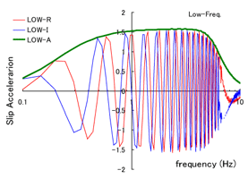 すなわち地震波形を比較した場合、変位では両者に大きな振幅の違いが出ますが、加速度にはあまり差が出ないことになります。