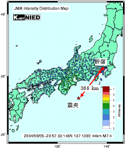 ・2004/9/5 紀伊半島沖地震(M7.4) 深さ44 km 新宿まで約368 km