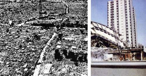 右:1985年メキシコ地震(政府合同庁舎、21階建て鉄骨造の倒壊、後ろは同じ21階建物で傾斜)