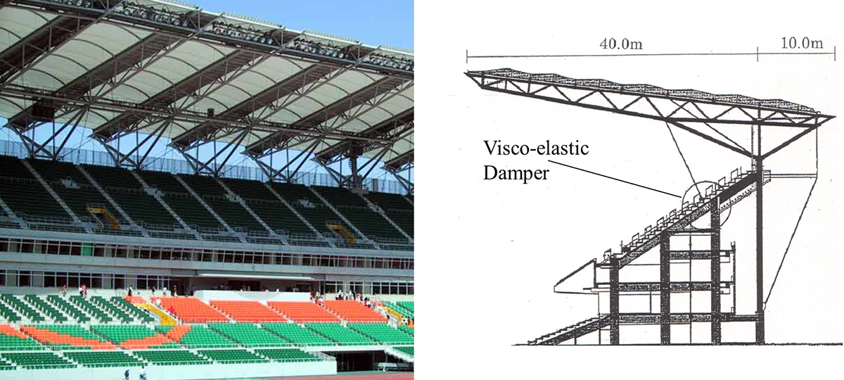 この方法は実用化され、【図10】に示すサッカースタジアムのフロントケーブル定着部にばね付粘弾性体ダンパーが設置されました。