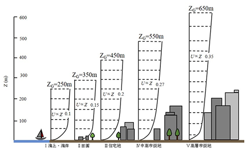 地表付近の風は地表面摩擦の影響を受け、乱れを伴うと共に風速が上空の風より減少します。平均風速および乱れの強さの地上からの高さによる変化を「風のプロファイル」と呼んでいます。平均風速のプロファイルを表す式としては「対数法則」と「べき法則」の2つがありますが、耐風設計の分野では、以下に示すような「べき法則」が一般に用いられます。
