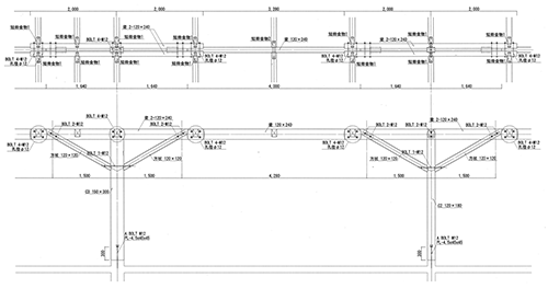 主架構の形状は、原則として定尺材を使用することを念頭に置き考えた。その結果、教室などの大きなスパンでは、材端支持点に方杖を用いた架構形状を採用した。柱から方杖を出すことにより、梁スパンの支点間距離を短くした(【図2】)。