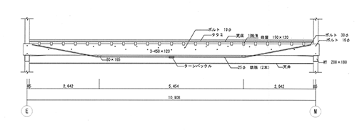 - 2階大広間、25~28通りの4本の床梁は下階に大きな西洋間があるため、約11mを飛ばす梁である。120×430のダブル梁の側面に、25Φの鋼棒を中央下端から端部上端に向け吊り上げる形で配置しており、現代の張弦梁形式となっている(【図7】)。